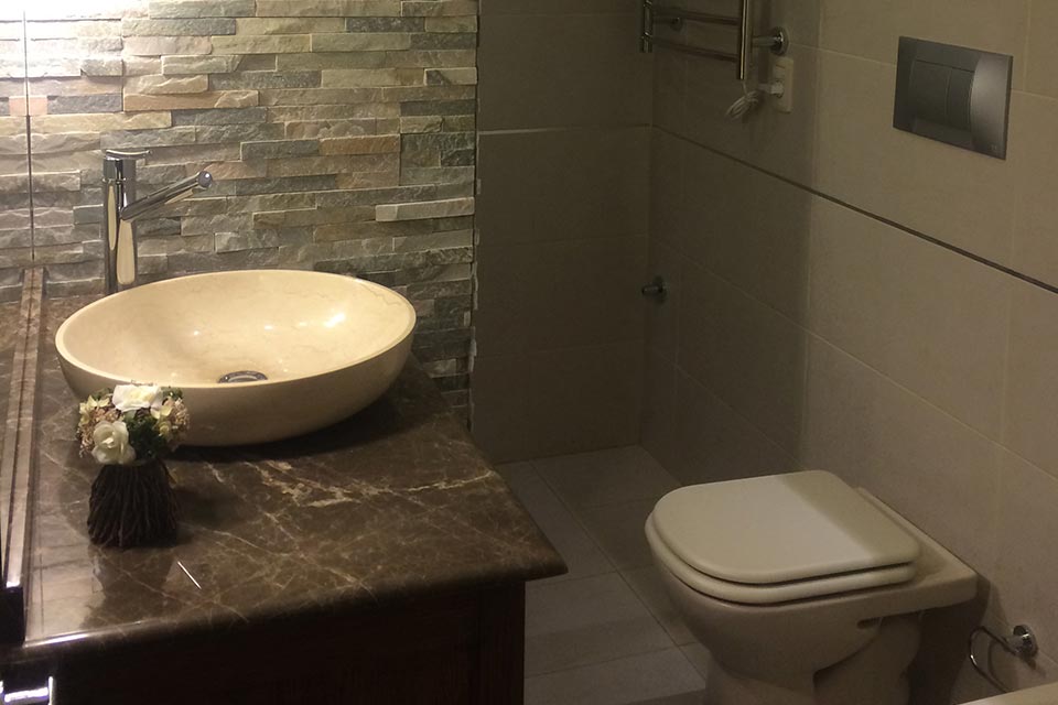 Reforma integral de baño principal. Primeramente cambiamos la antigua disposición para darle mayor amplitud al baño. Luego realizamos trabajos de sanitaria, eléctrica, revestimiento, pintura e instalación de equipamiento a medida.