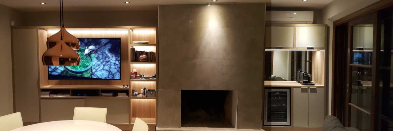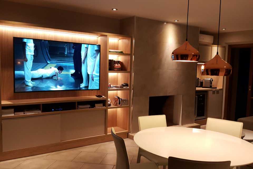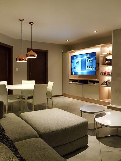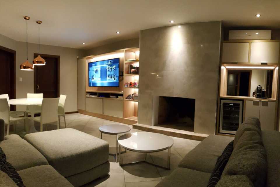 Diseñamos a medida los racks empotrados con iluminacion led dimerizable, los mismos tenían que contemplar lugar para guardado, incorporación de aparatos electrónicos y un sector destinado al winebar.